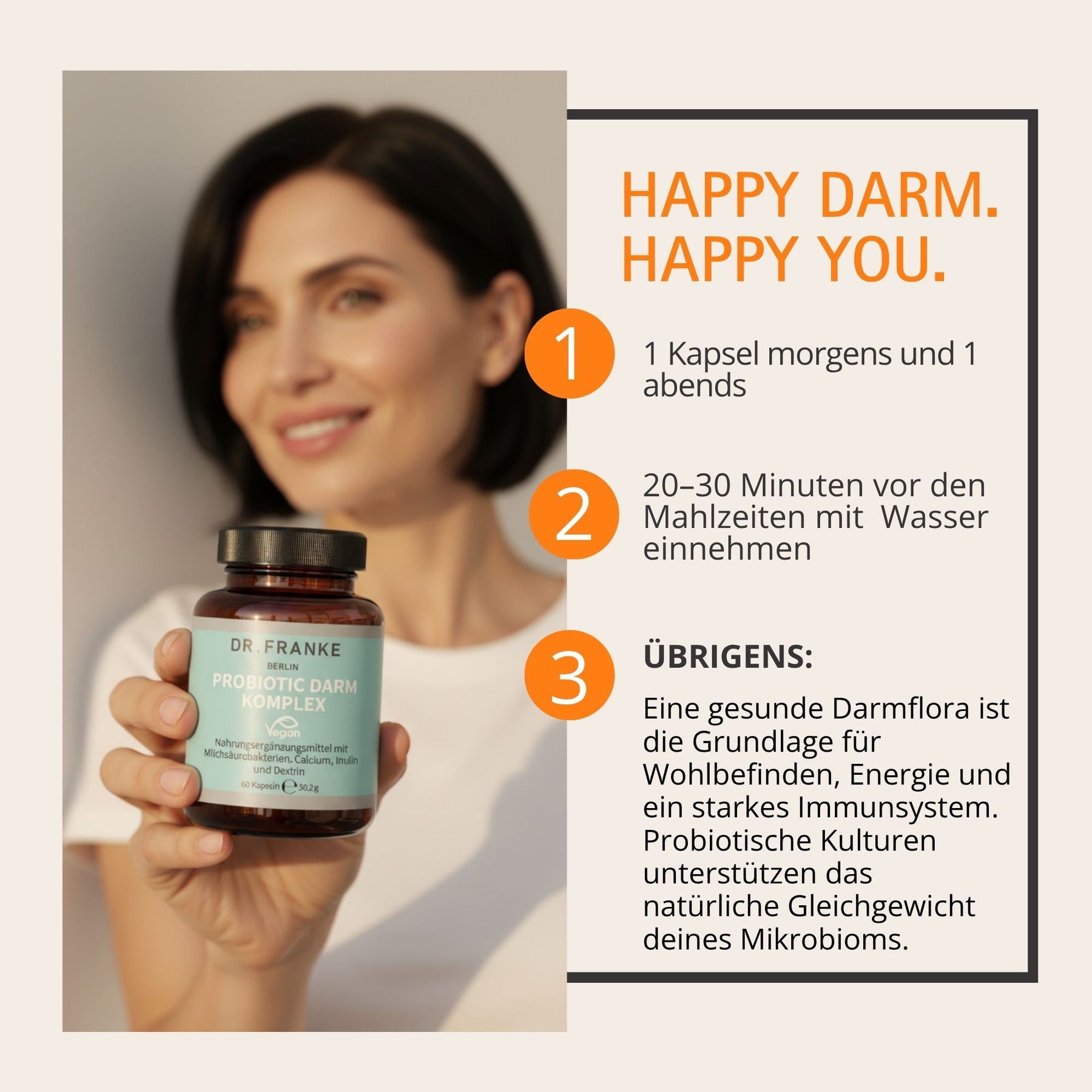 • Die empfohlene Tagesdosis Probiotic Darm Komplex morgens und abends auf nüchternen Magen, spätestens aber 20-30 Minuten vor den Mahlzeiten mit reichlich Wasser einnehmen.